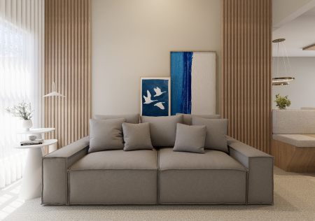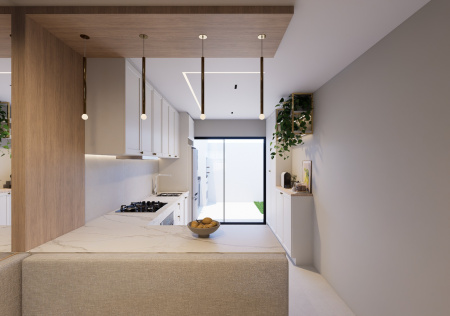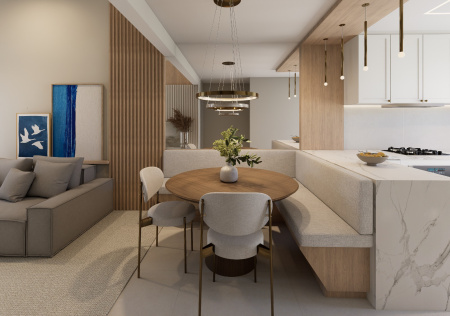 Sala e cozinha em conceito aberto com pé-direito duplo, trazendo amplitude e sofisticação