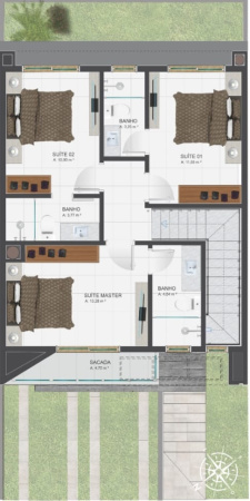3 suítes bem distribuídas, incluindo uma suíte máster com duas cubas, dois chuveiros e sacada;